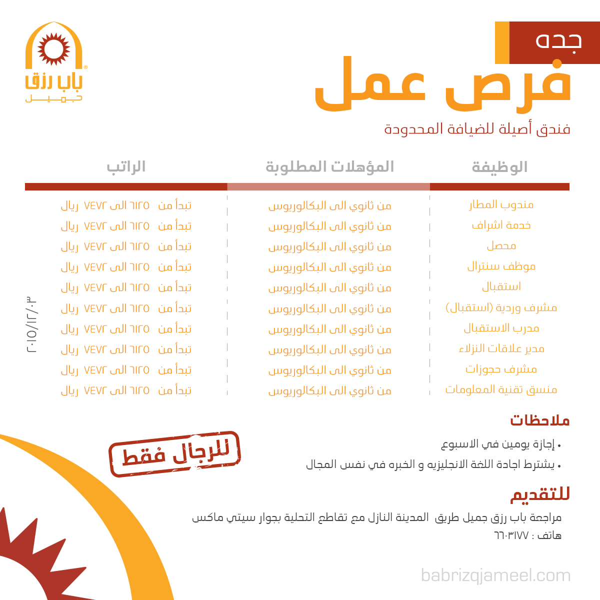 Pagesbusinesseslocal servicebusiness serviceemployment agencyrecruiterباب رزق جميل. شركة باب رزق جميل تعلن عن 3 وظائف شاغرة لحملة البكالوريوس بمجال المبيعات براتب 8000 ريال. وجدت مبادرة باب رزق جميل استكمالاً لمبادرات عبد اللطيف جميل لدعم الشباب من. تربط المبادرة الباحثين عن عمل بأرباب العمل، وتوفر الدعم والتمويل بدون فائدة لرواد الأعمال، إلى. باب رزق جميل يعلن توفر 16 وظيفة شاغرة للنساء حملة الدبلوم فأعلى.